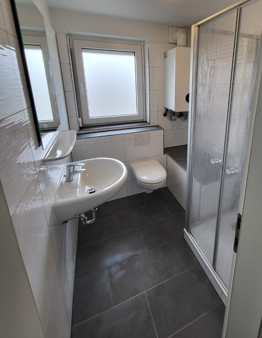 Neues helles Duschbad mit Waschbecken und Hänge-WC .
