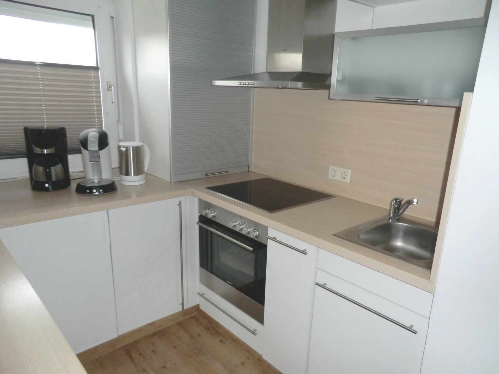 Eine Küchenzeile mit Ceranherd mit Backofen, Kühlschrank,